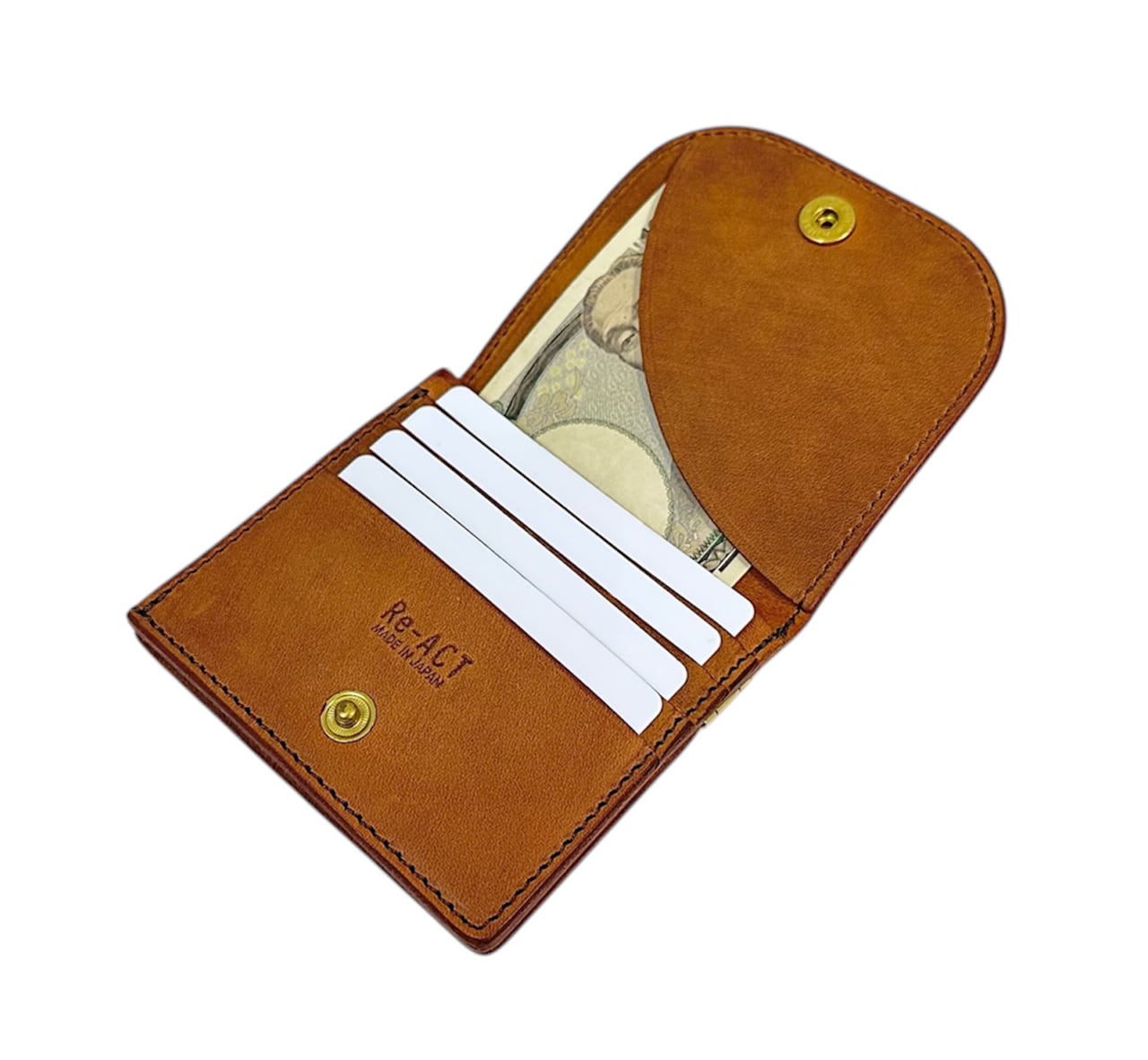 Re-ACT新型のスリム財布。小銭入れの位置を背面に配置。形状を口バネクリップにする事で見た目がスッキリとシンプルに。あえてファスナーを使わず口バネ金具を使用する事で簡単に小銭の出し入れが可能。カードは4枚収納可能。お札は折りたたまずにそのまま収納できます。スナップボタンはイタリアのFiocchiを使用。