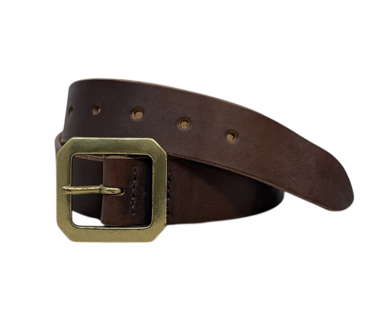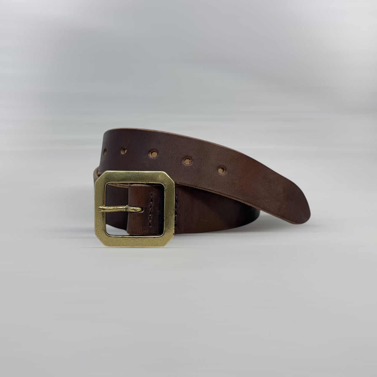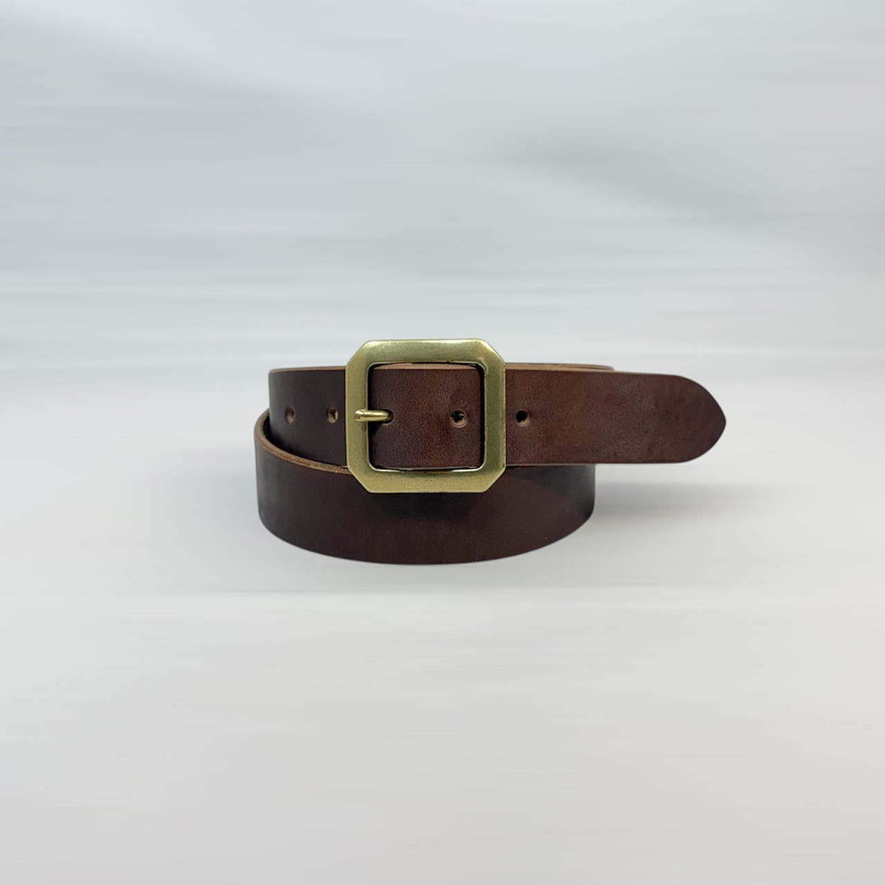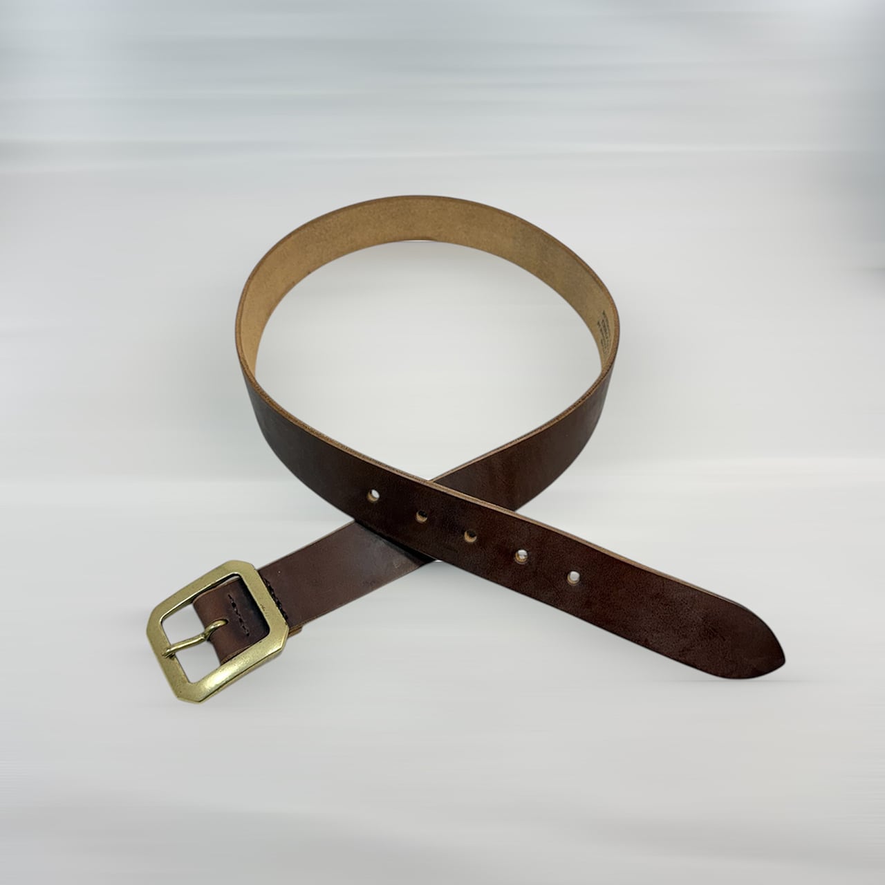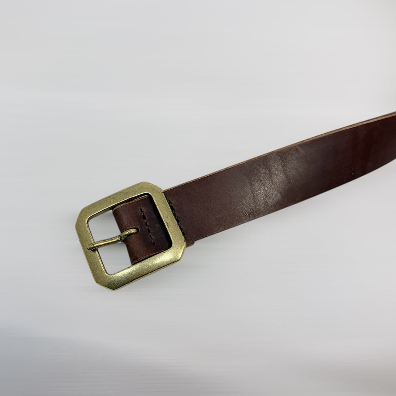 バックルは長方形の程よく存在感があるシンプルな物をチョイス。バックルは手縫いで留めてあります、。少し短めのバックルなので、硬すぎる革ですと装着した時に収まりが悪くなってしまいますが、オイルをたっぷり含んだ『クロムエクセル』ですのでぴったりと収まります。様々なメーカーが施品作りに使用している素材ですが、革素材の特性とベルトパターンが非常にマッチしたギャリソンベルトに仕上げることが出来ました。