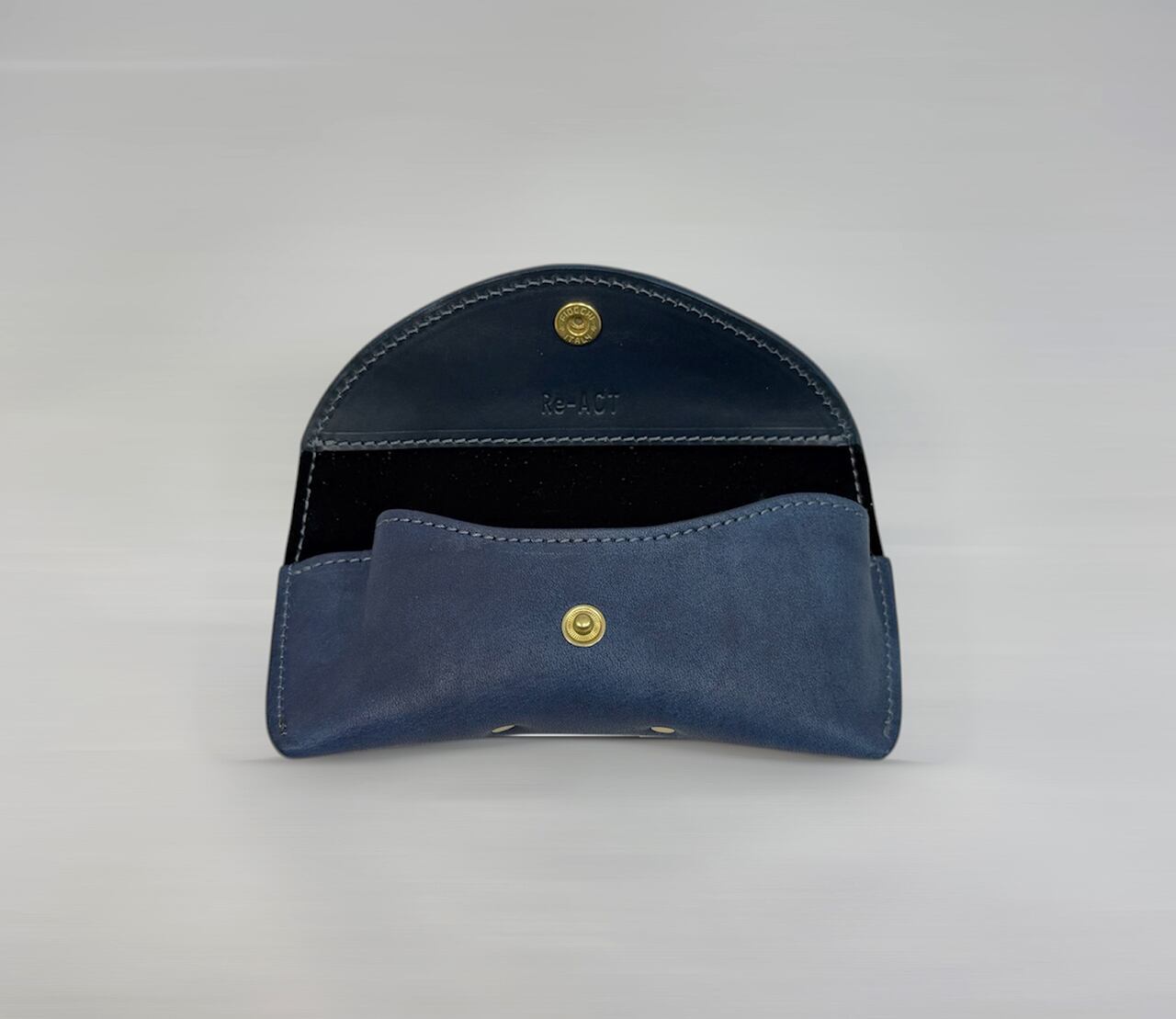 内側にはスエード調の生地を貼り付け、メガネを優しく包みます。内部にはケースの中でメガネを固定する鼻当てがあります。