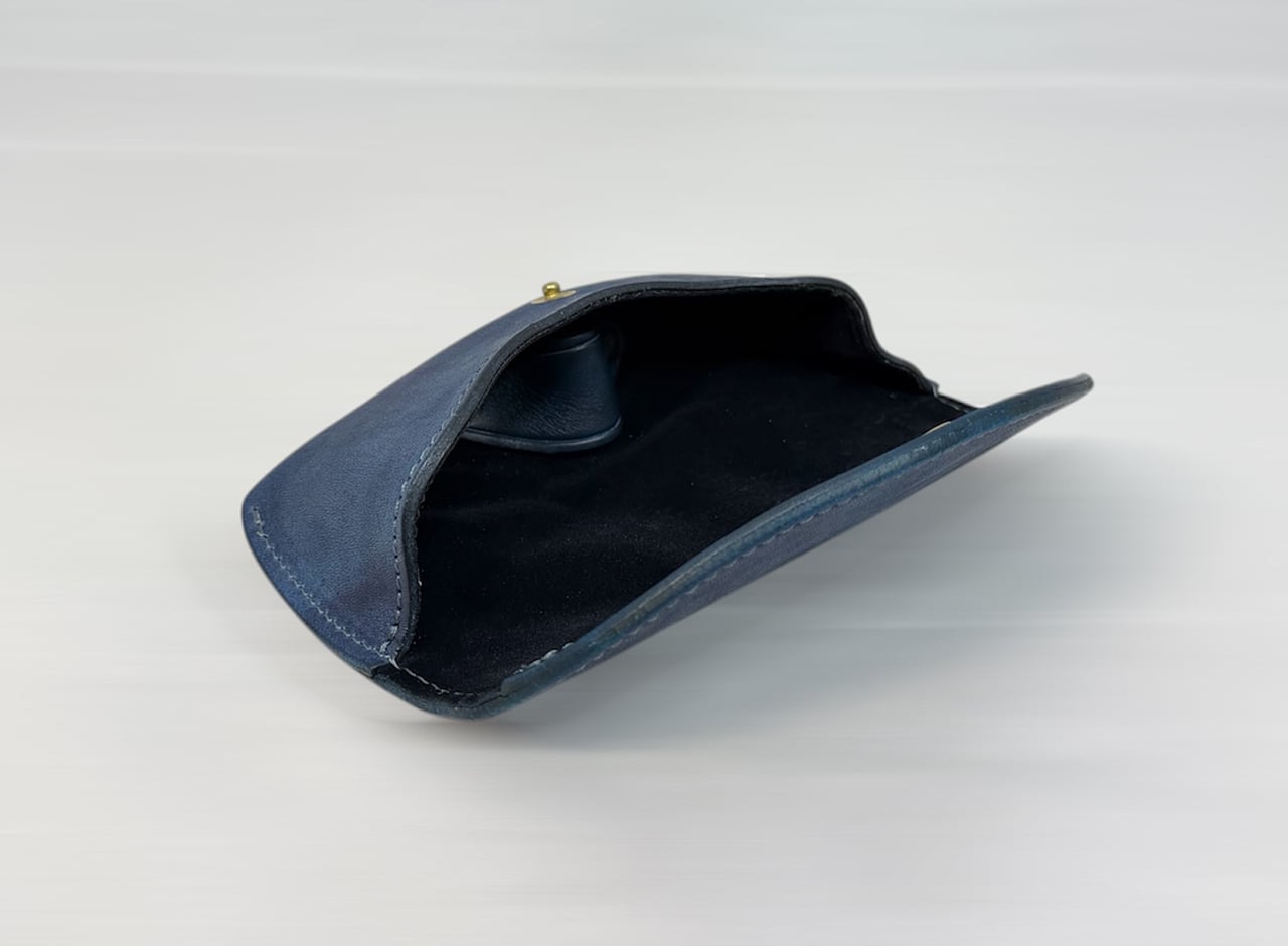 このレザーは、単なる色ではなく『育つ青』使うほどに藍色が変化し、手の脂や日光、時間と共に革の表情が育っていきます。まさに持ち主とともに成長する素材です。