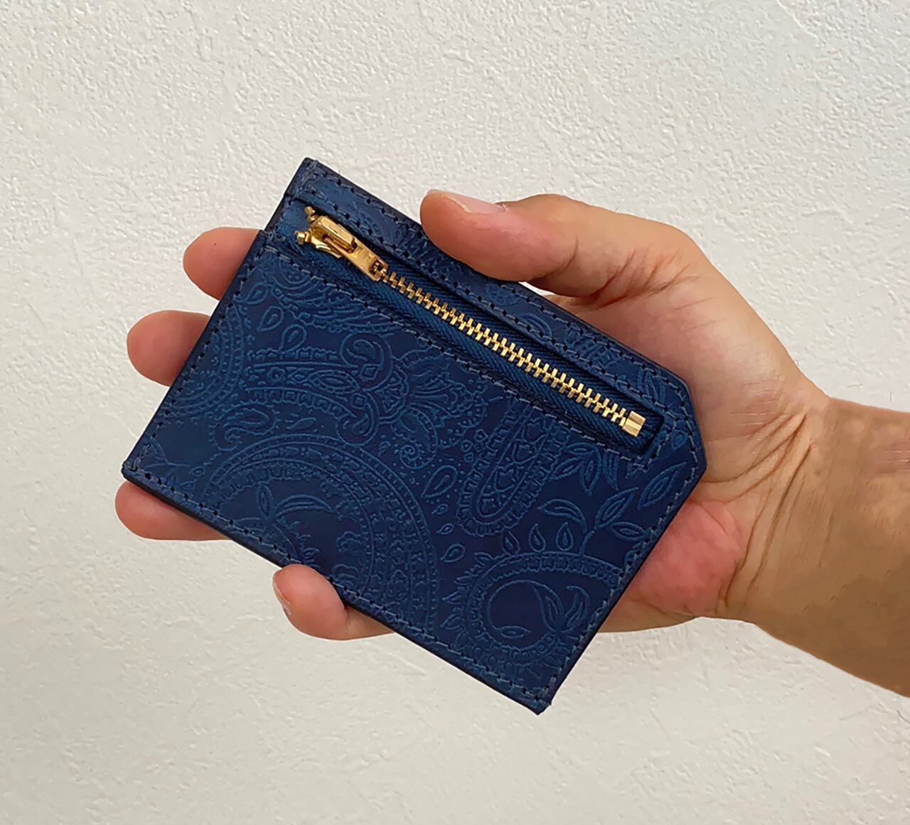 この作業を何度も繰り返し藍本来の色に仕上げていきます。最後の仕上げとして艶が持続する特殊なオイルを塗り込み、光沢感を出しています。この作業をすることにより、使用していくうちに艶が増して深い藍色に経年変化していきます。その藍染めをした革にペイズリーの型押しをいれました。その藍染めをした革にパッチワーク風の型押しをいれました。