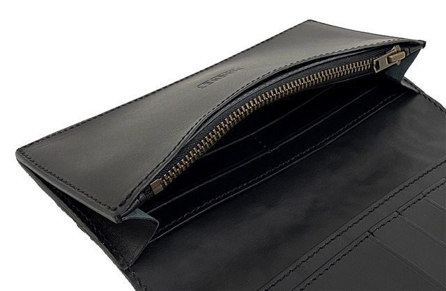MAGNET、二つ折り長財布。クロをベースにカラフルなカラーで構築したスキモレザー豚革バージョン。大容量の長財布。カードは10枚収納可能。札入れ、コインポケット、フリーポケットも充分な容量。ファスナーはユニバーサルファスナーを使用しています。