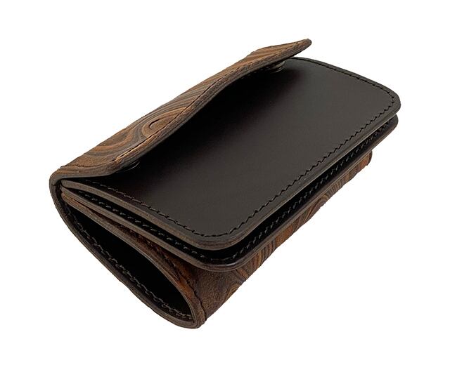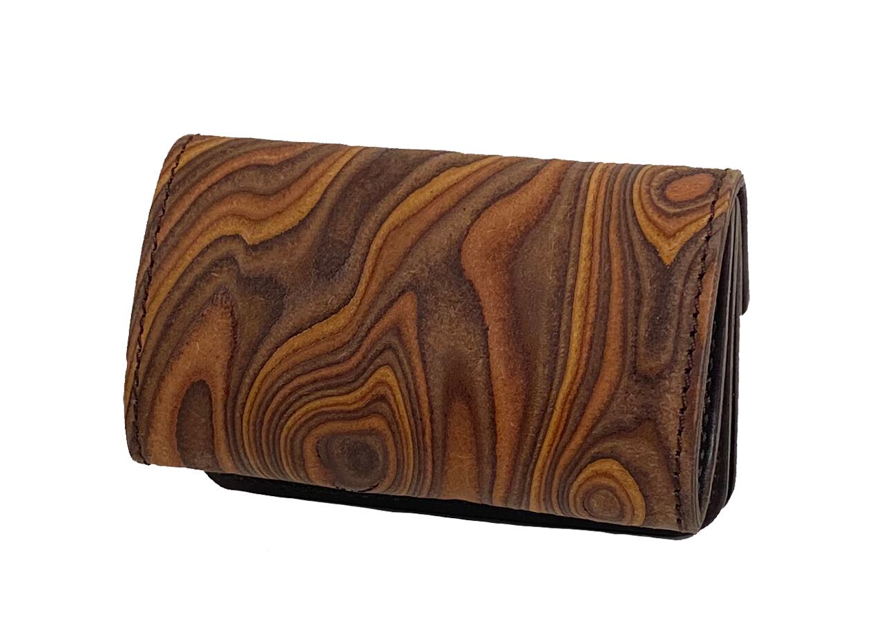 人を引きつけるモノ作りをコンセプトに『スキモレザー』を中心に展開。MAGNETで使用している『スキモレザー』は、タンニンなめしの牛革を職人である大久保氏の手により染色。その染色した牛革を型押しして幾重にも貼り重ね椎積させ、これを層状に対して水平方向に漉いて『スキモレザー』が誕生する。このような構造であるから模様は立体的で直線や曲線および複雑な木目模様など無限に可能であり、また銀面と床面の繊維が複雑に重なり合い、かつ接着面積を大きくできるため全方向からの力に強い。断面の模様が1枚ずつ異なる表情を出すため、すべてのプロダクトが一点モノとなる。染色方法から型押しの金型の設計まで大久保氏自ら手掛ける。密な立体構想があればこそできるオンリーワンな技術です。