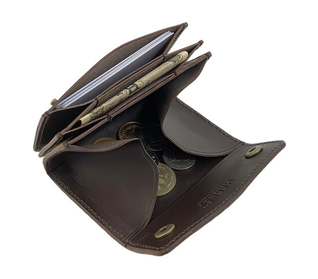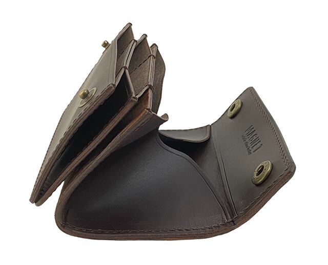 MAGNET蛇腹財布。バッグの小型化に伴い近年財布もコンパクト化されつつある。蛇腹状のポケットを2室搭載。カードなら1室5枚収納可能。お札は4つ折りにすれば収納可能。小銭入れはマチ部分を大きく取ることにより、小銭入部分が見易いという利便性に加え、取出しやすくなっています。手のひらで収まるサイズ感。パンツの前ポケットにも違和感なく収納可能。