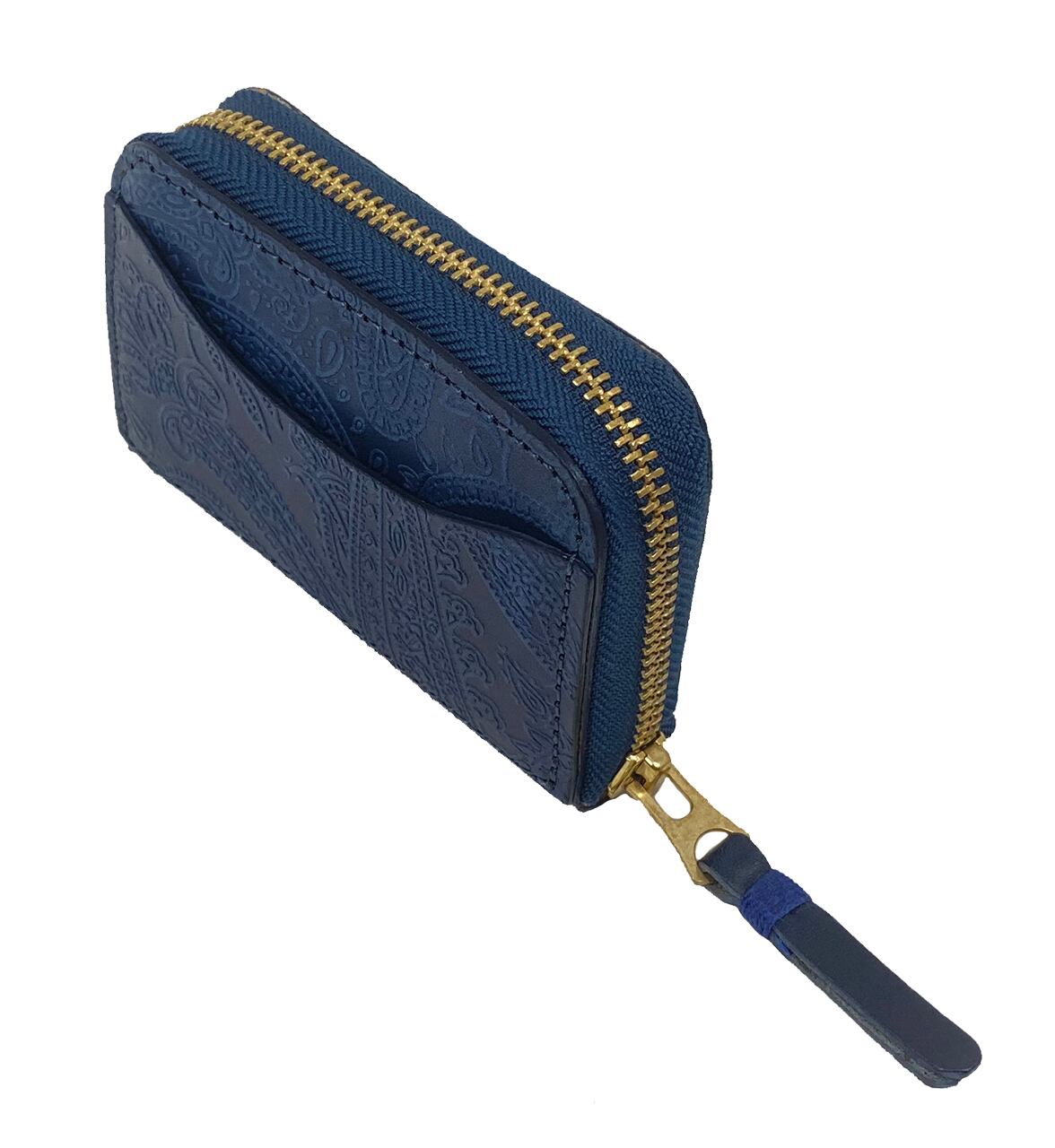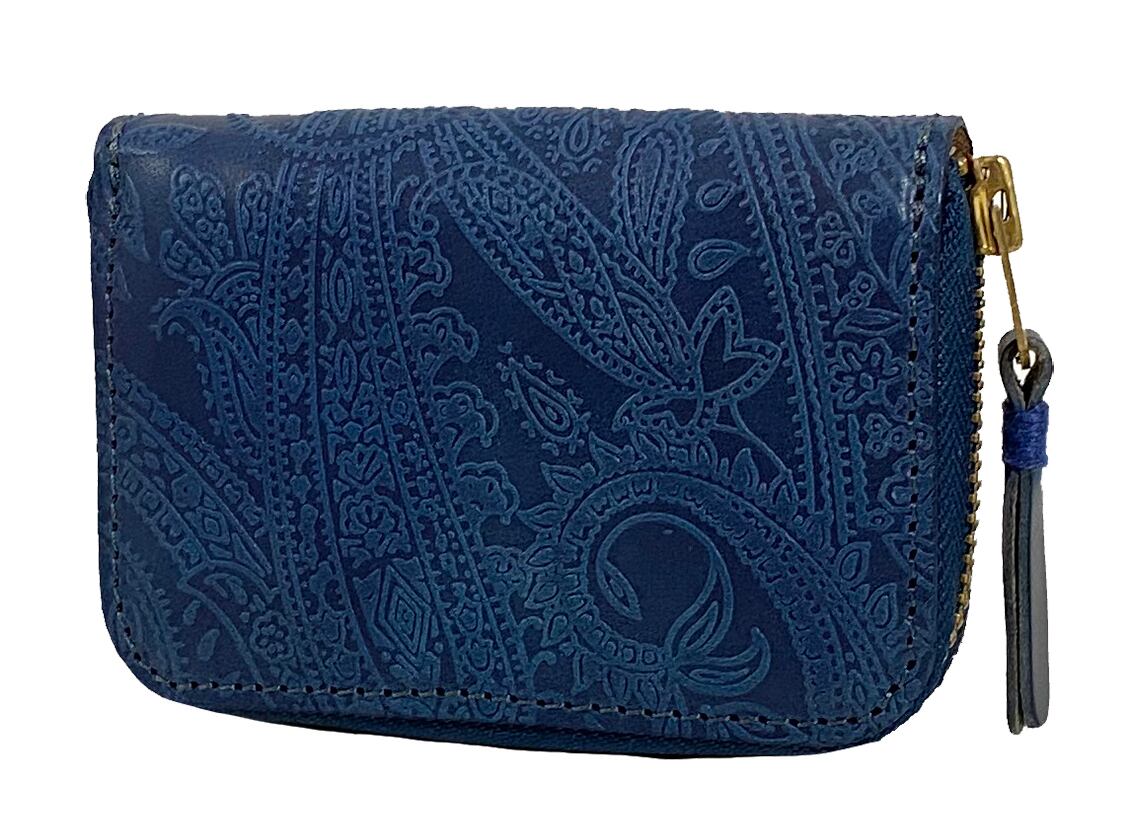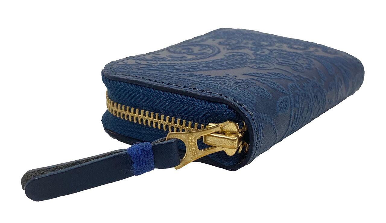 この作業を何度も繰り返し藍本来の色に仕上げていきます。最後の仕上げとして艶が持続する特殊なオイルを塗り込み、光沢感を出しています。この作業をすることにより、使用していくうちに艶が増して深い藍色に経年変化していきます。その藍染めをした革にペイズリーの型押しをいれました。ペイズリーの型押しも通常の型押しより強めに入れ、より立体感を出しています。