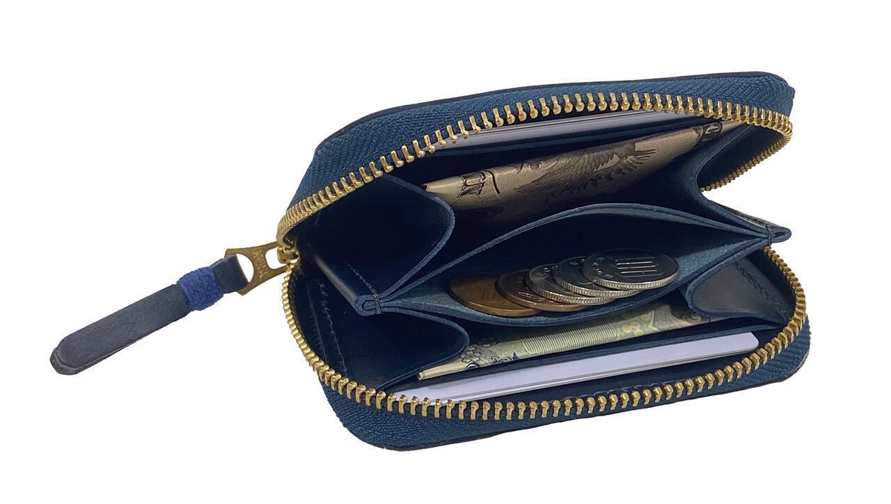 手の平サイズのコンパクト財布。カードはひとつのポケットに2~3枚収納可能。お札は4つ折りで収納。ファスナーはYKK社のユニバーサルファスナーを使用しています。今の時代にあったミニマリストな財布です。
