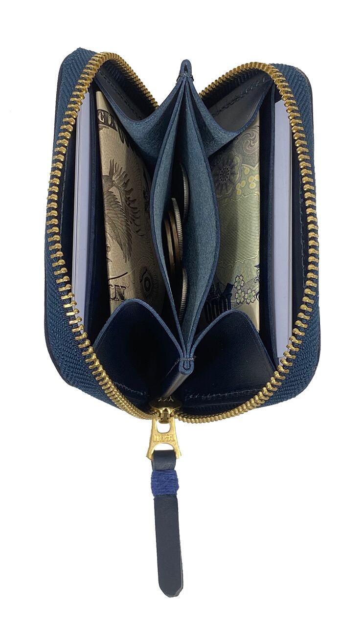 手の平サイズのコンパクト財布。カードはひとつのポケットに2~3枚収納可能。お札は4つ折りで収納。ファスナーはYKK社のユニバーサルファスナーを使用しています。今の時代にあったミニマリストな財布です。