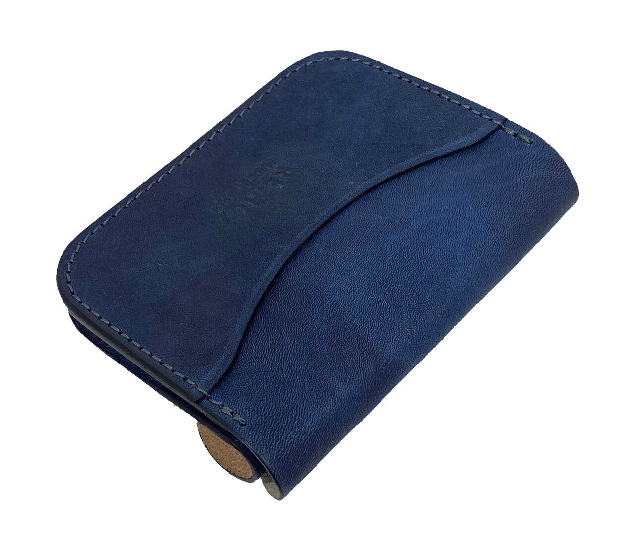 Wフラップのちょっと小ぶりな財布。背面にカードポケット、上部フラップを開けるとカード3枚とお札が収納可能なフリーポケット。手前のフラップはコインポケット。手前のフラップにはカードも収納可能。スナップボタンはイタリアのFiocchiを使用。