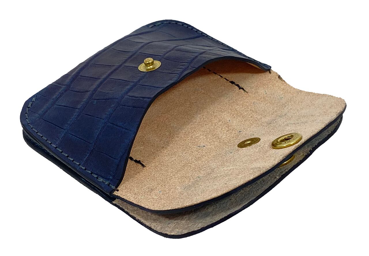 Wフラップのちょっと小ぶりな財布。背面にカードポケット、上部フラップを開けるとカード3枚とお札が収納可能なフリーポケット。手前のフラップはコインポケット。手前のフラップにはカードも収納可能。スナップボタンはイタリアのFiocchiを使用。