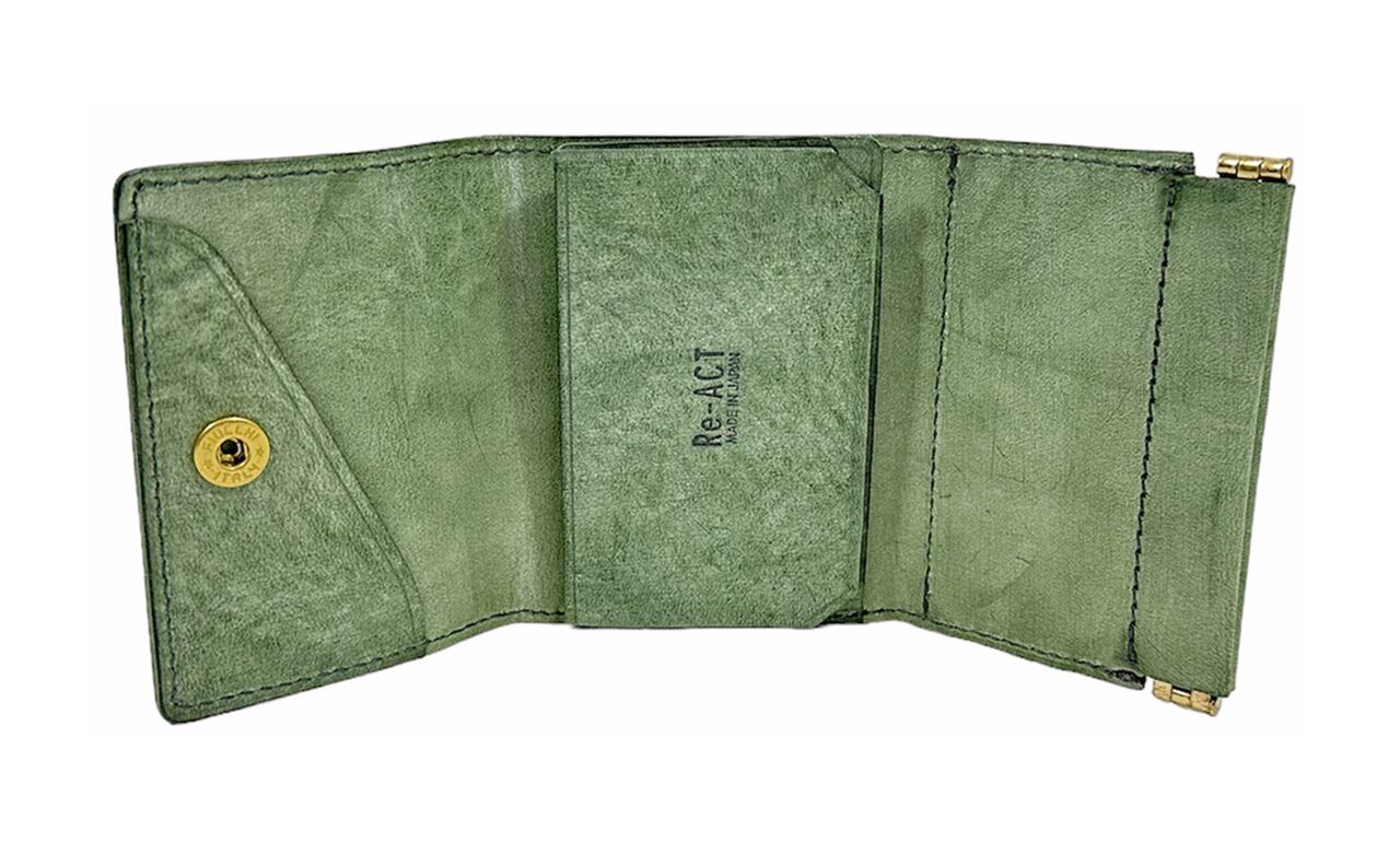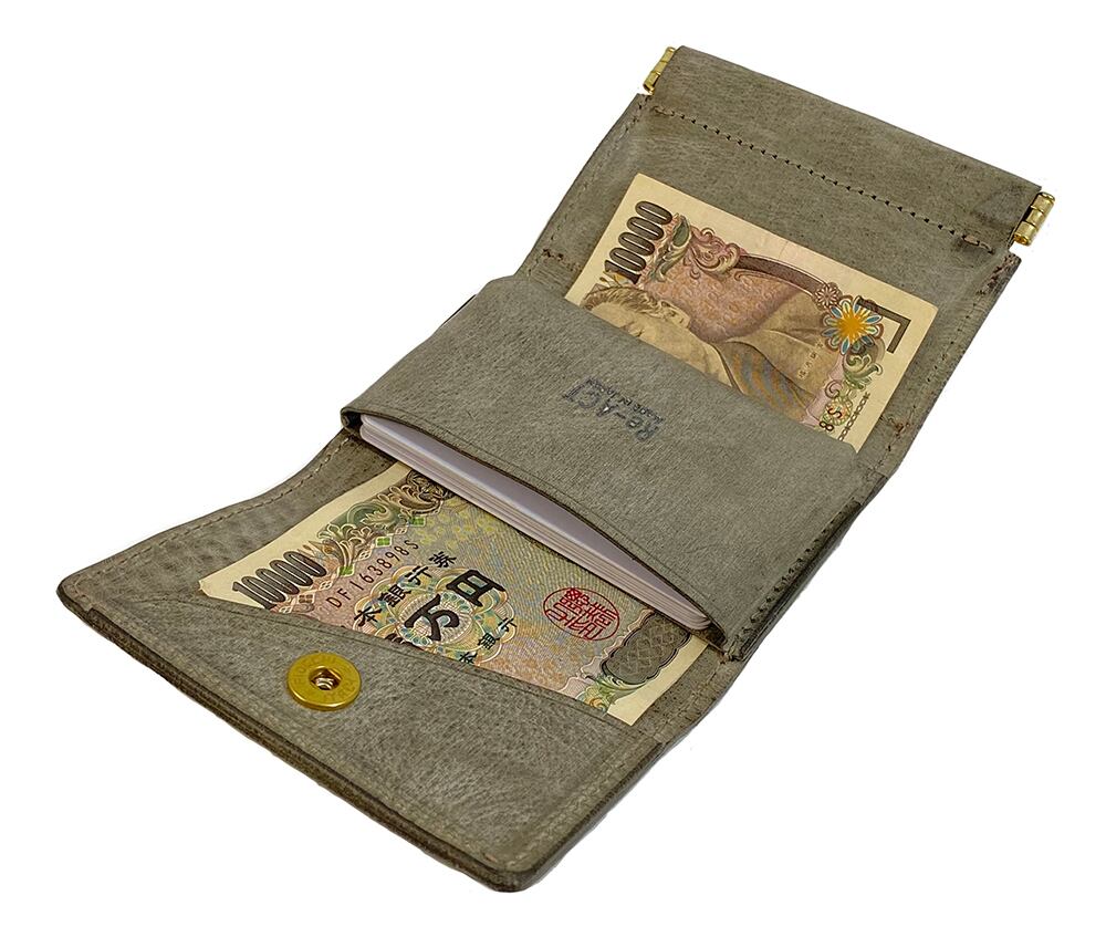 手のひらサイズのスマートな財布。コイン収納口は片手で開閉できるので、簡単に中身を確認できます。お札は折りたたまずにそのまま収納できます。カードはマチありのポケットなので、5枚〜10枚収納可能。スナップボタンはイタリアのFiocchiを使用。