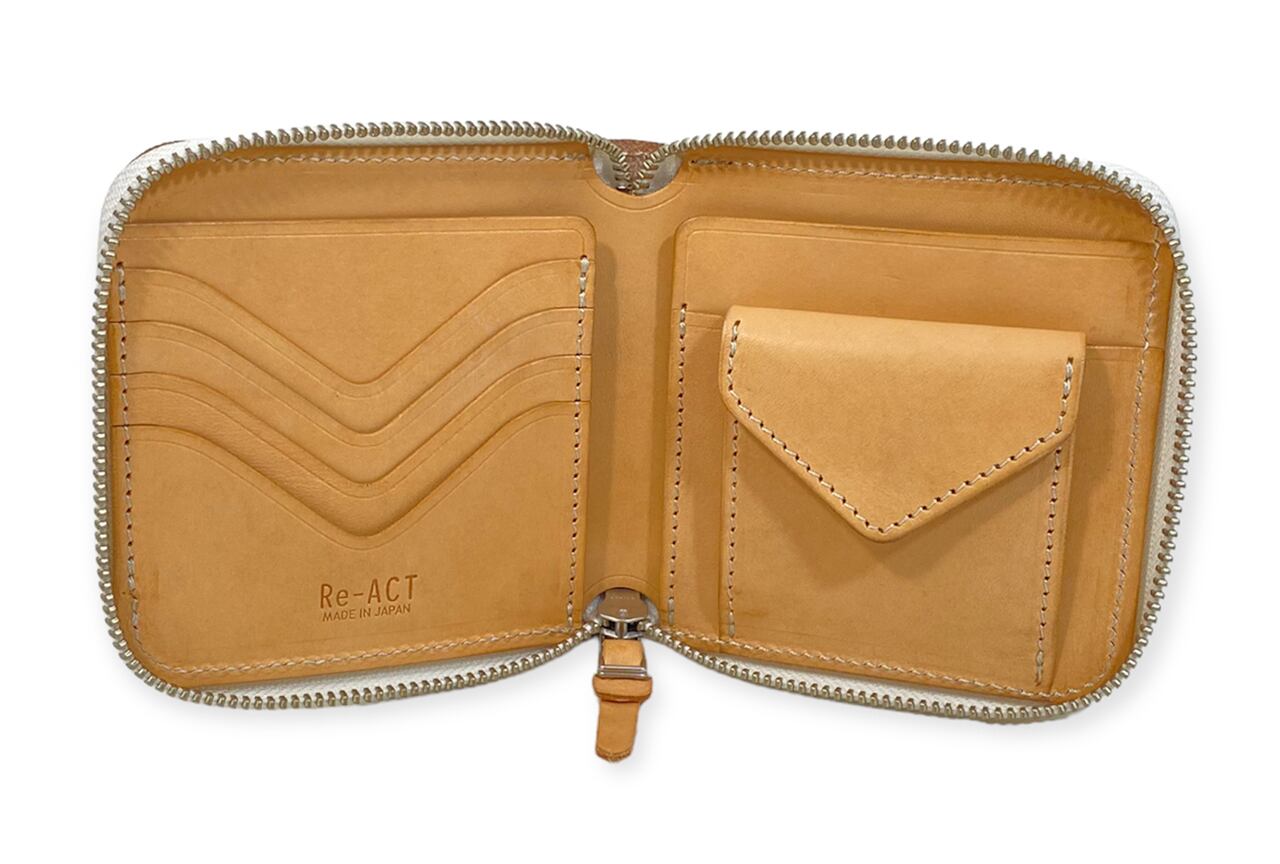 ミドルサイズのラウンドファスナー財布。左側に通常カードサイズのポケットが4枚分のカードが収納可能。コインポケットは小ぶりながらマチを十分に取っているので容量も入り小銭の出し入れもしやすいです。