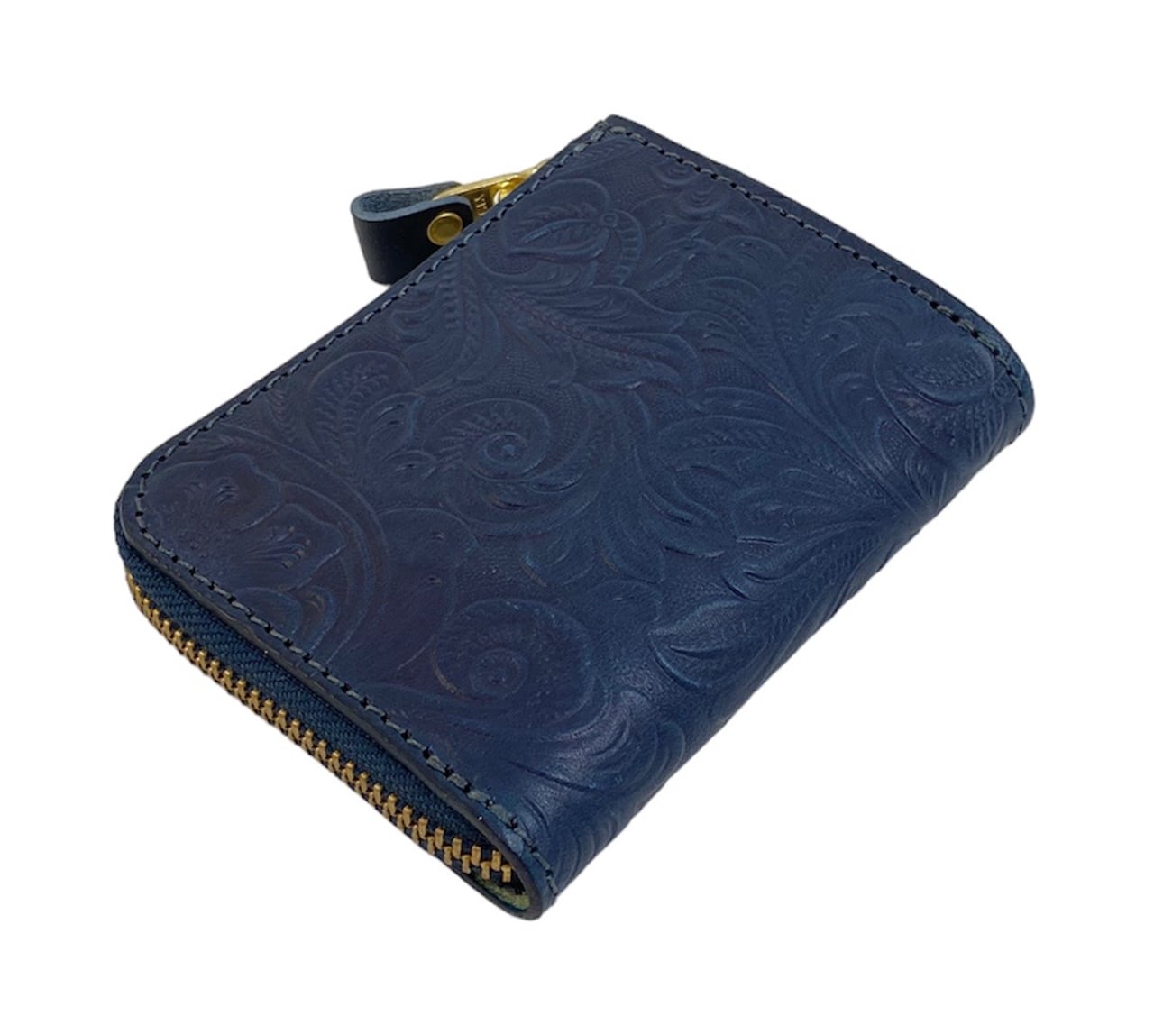 この作業を何度も繰り返し藍本来の色に仕上げていきます。最後の仕上げとして艶が持続する特殊なオイルを塗り込み、光沢感を出しています。この作業をすることにより、使用していくうちに艶が増して深い藍色に経年変化していきます。その藍染めをした革にフラワーの型押しをいれました。フラワーの型押しも通常の型押しより強めに入れ、より立体感を出しています。