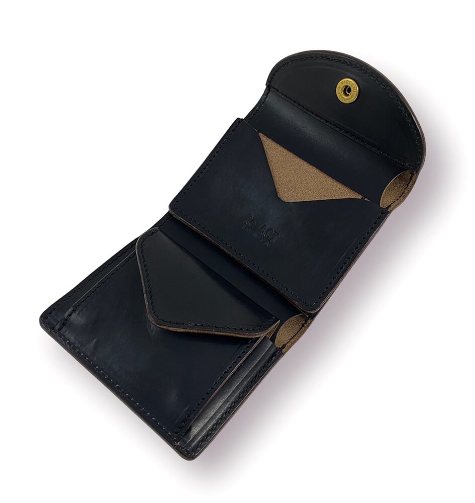 手のひらサイズの三つ折りコンパクト財布。スナップボタンはイタリアのFiocchiを使用。コンパクトながらカードはひとつのカードポケットに3枚カードを収納可能。コインポケットもマチを大きく取っておりますので容量も充分で出し入れも楽です。お札、小銭、カードが収納できるオールインワン設計です。